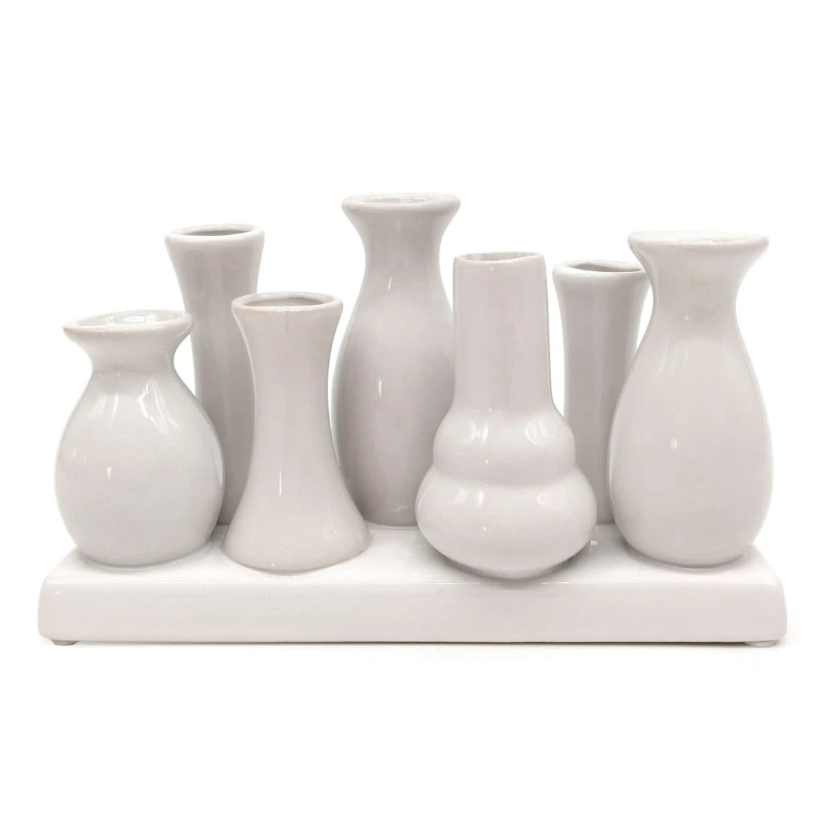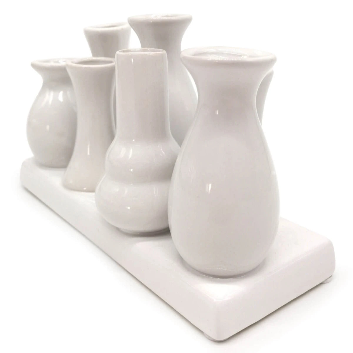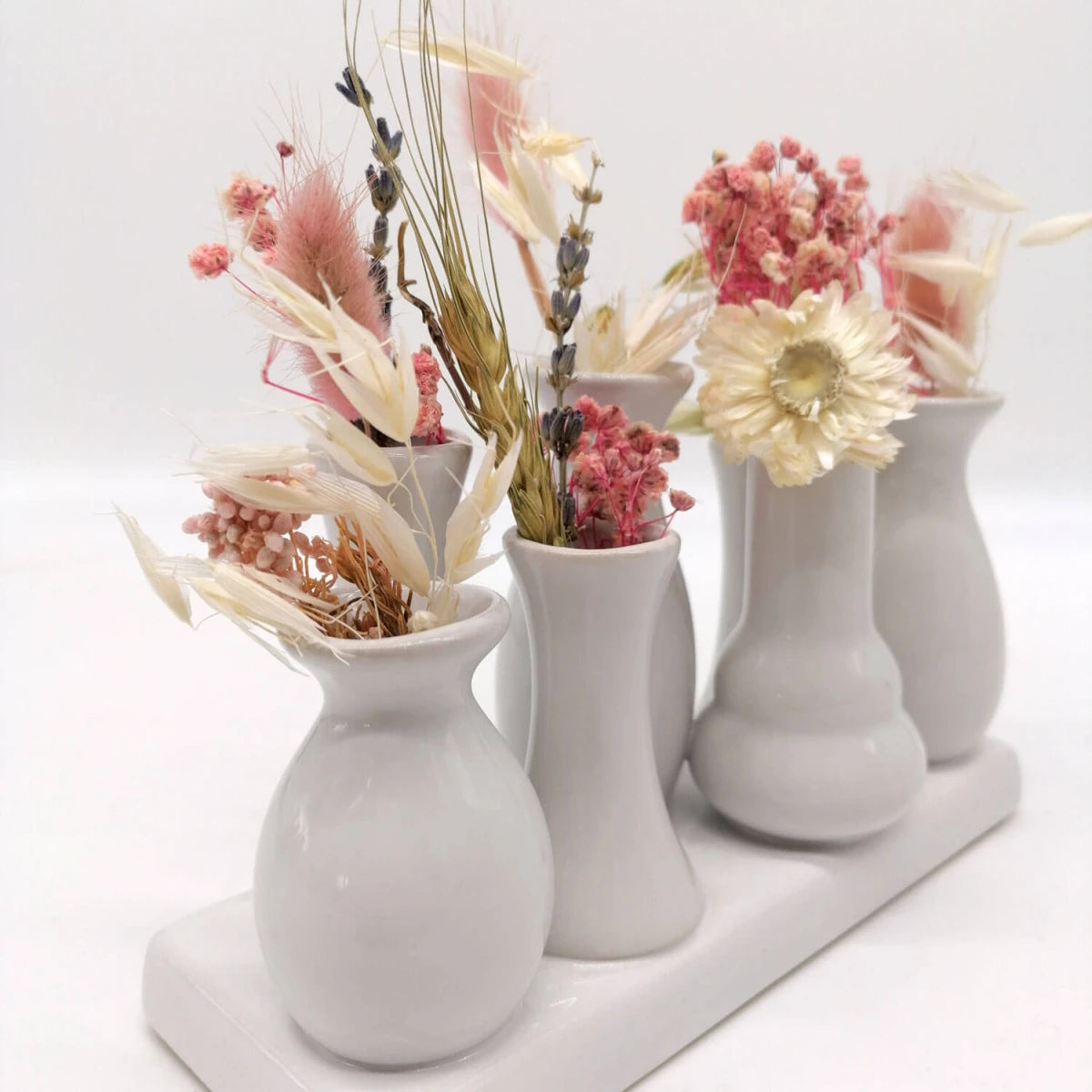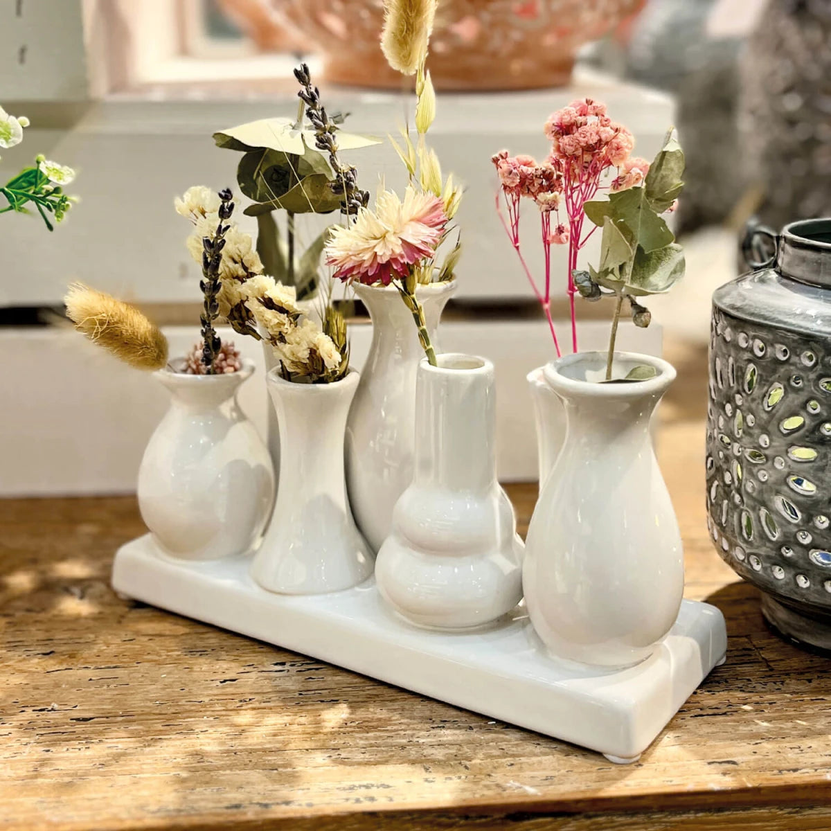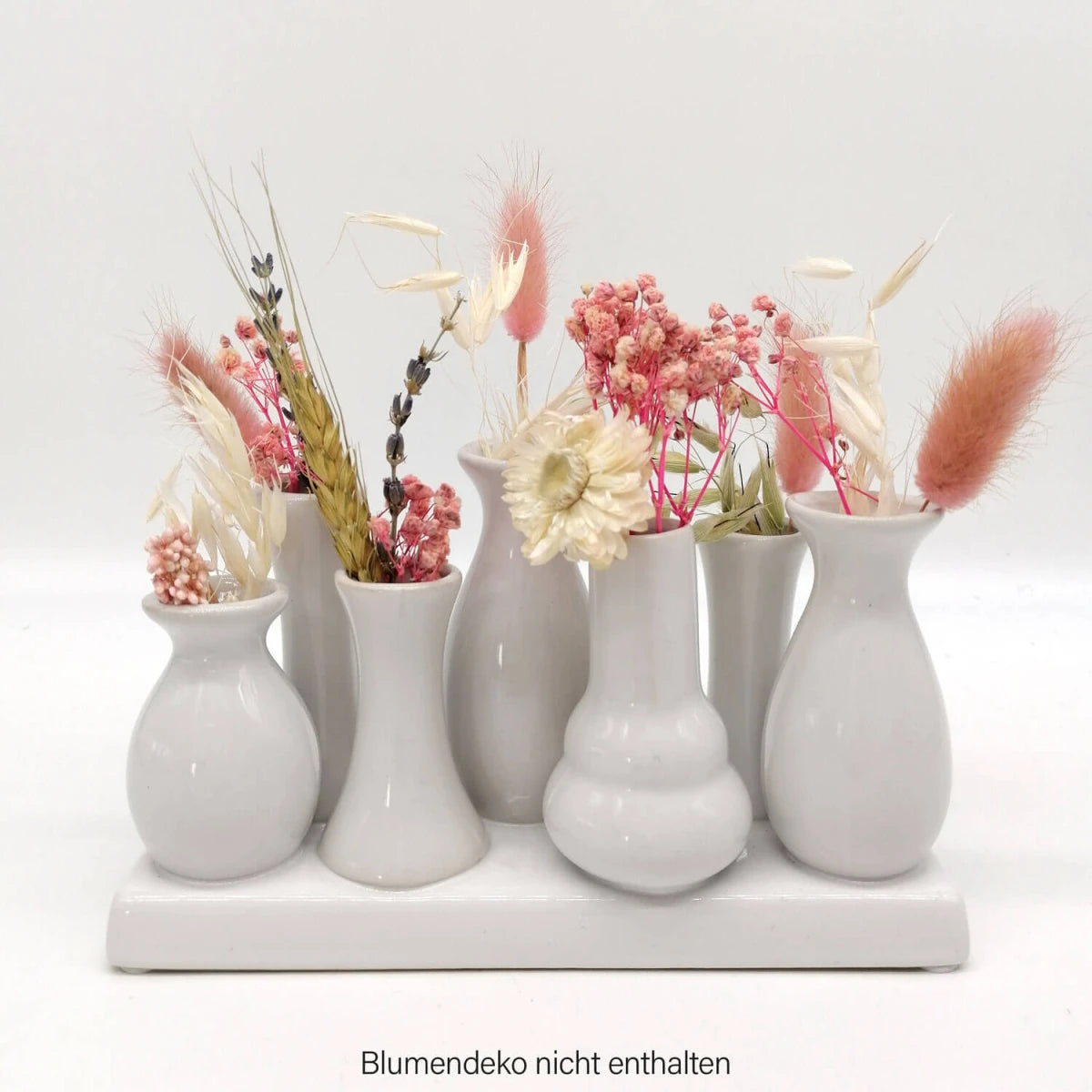 Das Arrangement aus sieben kleinen Vasen ist ein vielseitiges Dekoelement, das immer wieder neu mit einzelnen Blüten oder kleinen Sträußchen bestückt werden kann. Die weiße Keramik fügt sich wunderbar in jedes Interieur ein und lässt den Blüten Raum zu wirken.