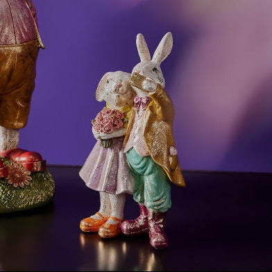 Das süße Hasenpaar freut sich über einen schönen Frühlingstag und hält den Moment mit einem Selfie fest. Die Dekofigur ist mit einem leicht goldenen Schimmer überzogen, der ihr einen ganz besonderen Look verleiht.