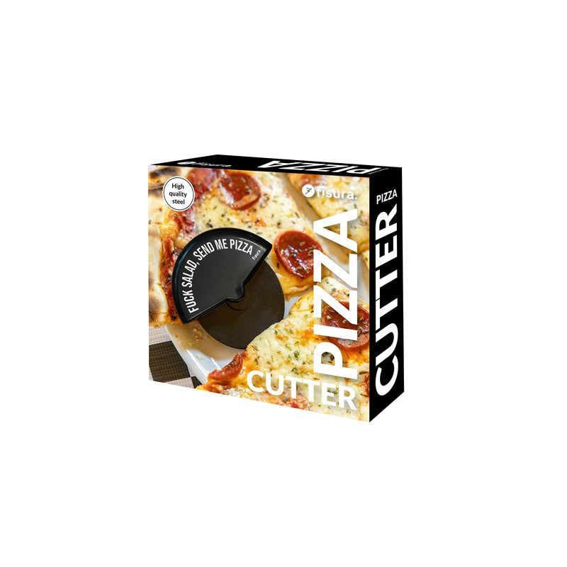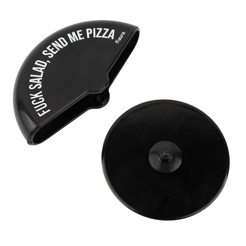 Der schwarze Pizzaschneider kommt mit eindeutiger Message "Fuck salad, send me pizza"!