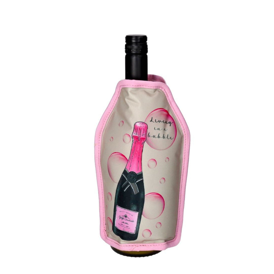 Dieses Modell kommt mit Champagnerflaschen-Motiv und "Living in a bubble"-Schriftzug. Verziert mit einer rosa Paspel.