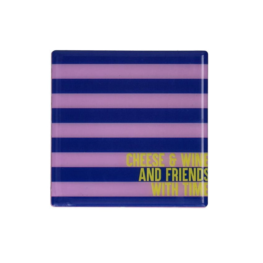 Der Untersetzer aus der "Love Tiles"-Reihe von Gift Company kommt im Streifendesign in Dunkelblau und Flieder mit der Aufschrift "Cheese & Wine And Friends With Time" in Gelb. Der perfekte Untersetzer für das Rotweinglas zur Käseplatte!