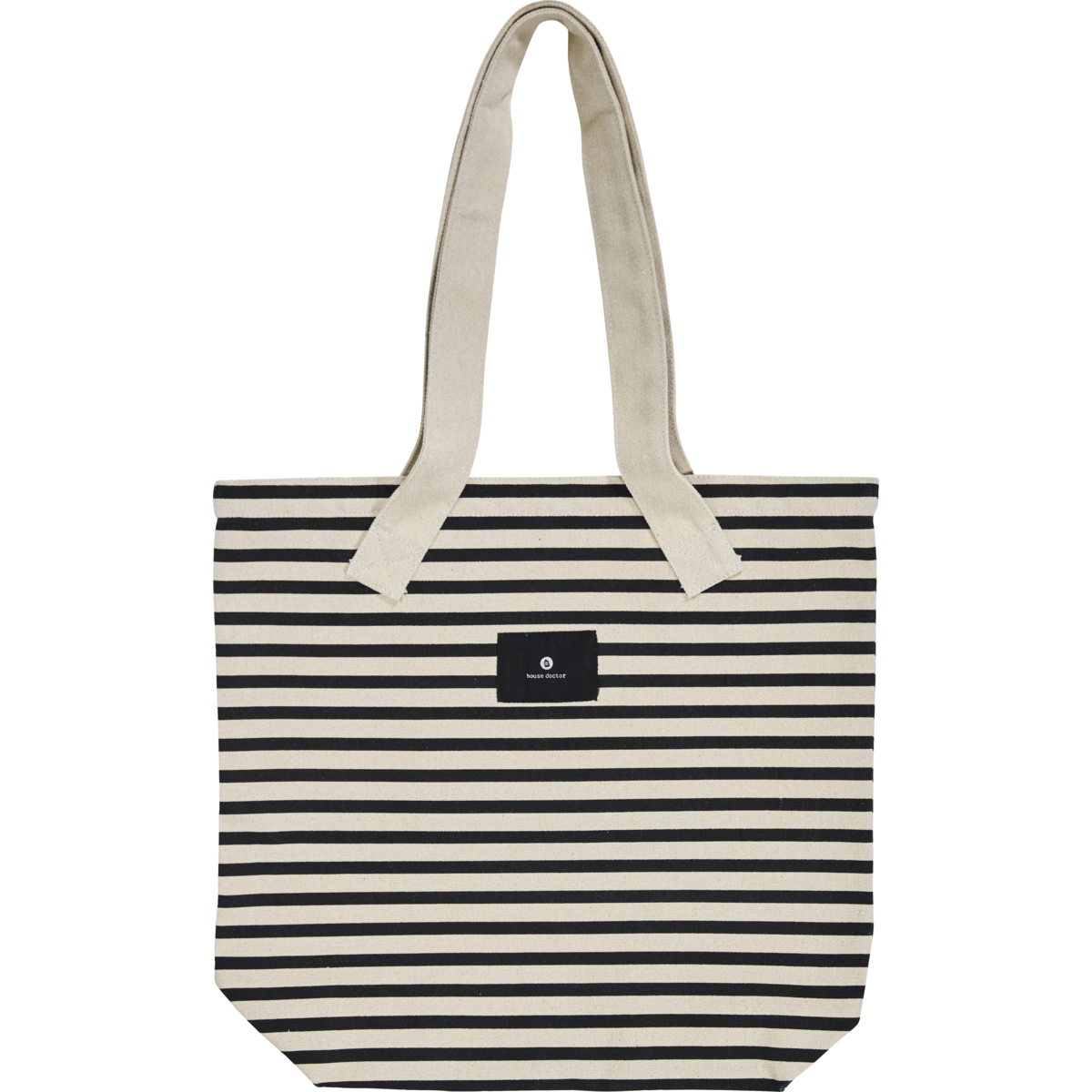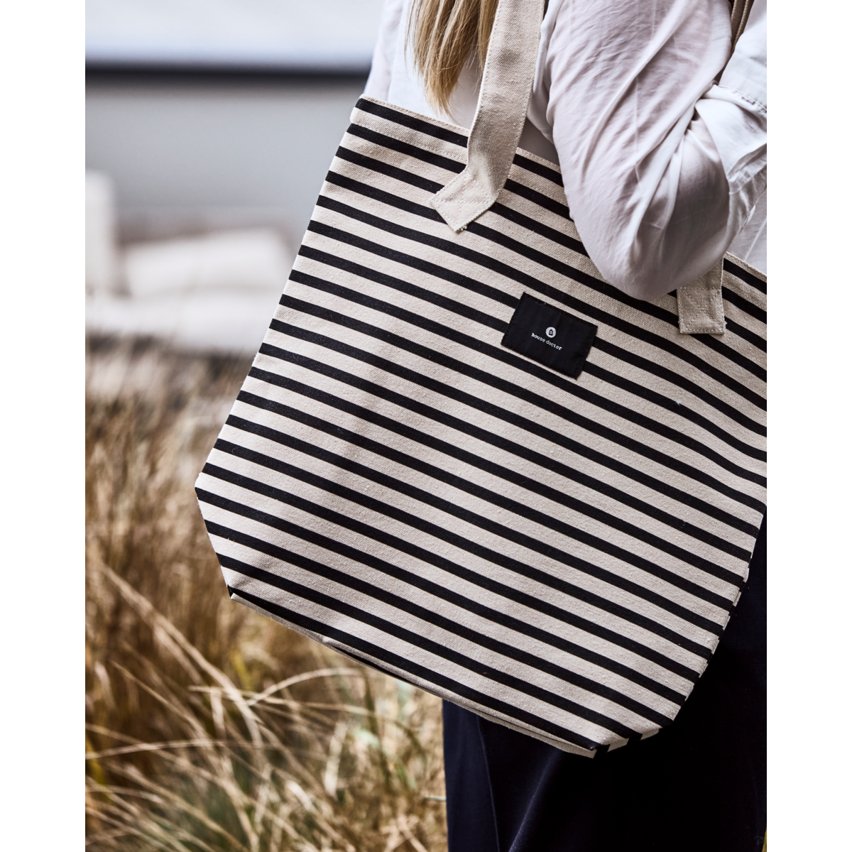 Der zeitlose Shopper von House Doctor aus der "Canva"-Reihe ist aus robustem, schwarz-weiß gestreiftem Stoff - ein treuer Alltagsbegleiter mit viel Stauraum und zwei praktischen Tragehenkeln! Im Inneren befindet sich eine kleine Tasche für Handy, Portemonnaie o.ä.