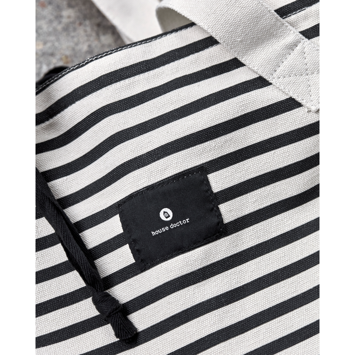 Die praktische Tasche im XL-Format von House Doctor aus der "Canva"-Reihe ist aus robustem, schwarz-weiß gestreiftem Stoff. Perfekt für Einkäufe, Strandtage oder als Wäschesammler. Innen kann die Tasche mit einem Zugband geschlossen werden.