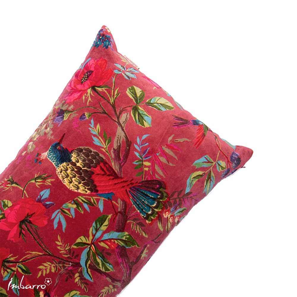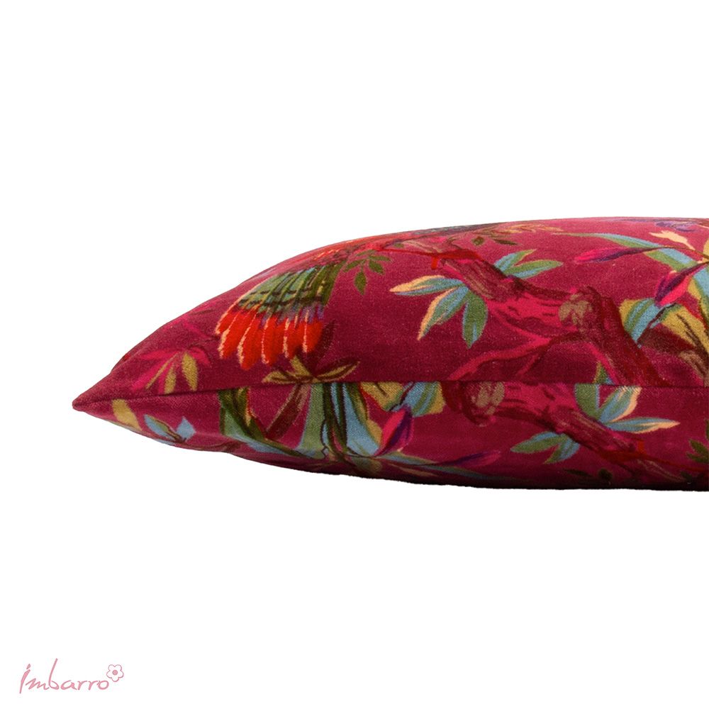 Das Kissen "Paradise" besticht mit einem opulenten Muster aus Blumen und Vögeln, das dem Namen des Kissens alle Ehre macht. Das kräftige Rot-Pink des weichen Samtstoffs ist ein echter Eyecatcher und bereichert jede moderne Einrichtung.
