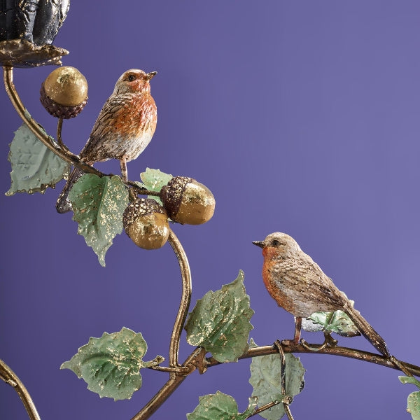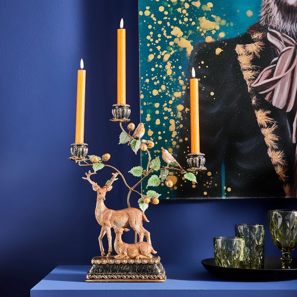 Der Kerzenhalter mit dem Hirschpaar ist besonders detailliert und liebevoll gestaltet. Die Hirsche stehen bzw. liegen auf einem verzierten Sockel. Das Geäst ist mit Blätter und Eicheln geschmückt, auf den Zweigen sitzen kleine Rotkehlchen. An den Enden der Zweige befinden sich drei Kerzenhalter für Stabkerzen.