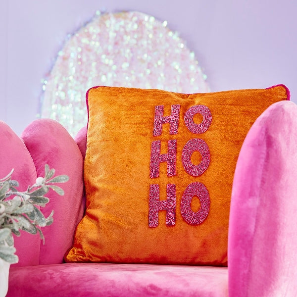 Das dekorative Kissen besticht mit seinem plakativen "HOHOHO"-Schriftzug und ist ein echter Hingucker in jeder Weihnachtsdeko. Das warme Orange des weichen Samtstoffs ist ein echter Eyecatcher; der mit pinken Perlen handgestickte Schriftzug gibt dem Kissen einen festlichen Look. Die Rückseite ist ebenfalls Orange, aus gewebtem Stoff in Leinenstruktur.
