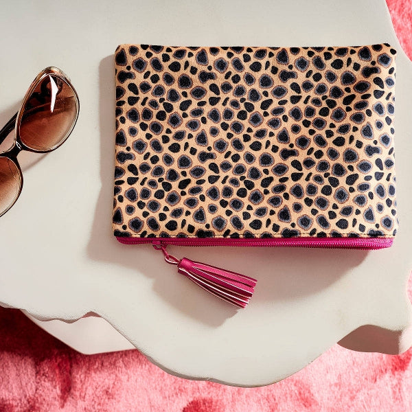 Die Kosmetiktasche kommt mit Leopardenprint auf kuschelig weichem Samt!