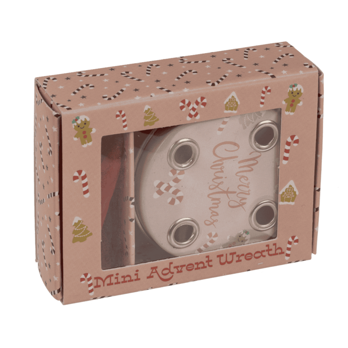 Der Mini-Adventskranz im Hosentaschenformat ist eine süße Aufmerksamkeit in der Weihnachtszeit, z.B. als Wichtelgeschenk oder Adventskalenderfüllung. Die kleine Blechdose mit "Merry Christmas"-Schriftzug und vier passende Kerzen sind in einem Geschenkkarton verpackt.