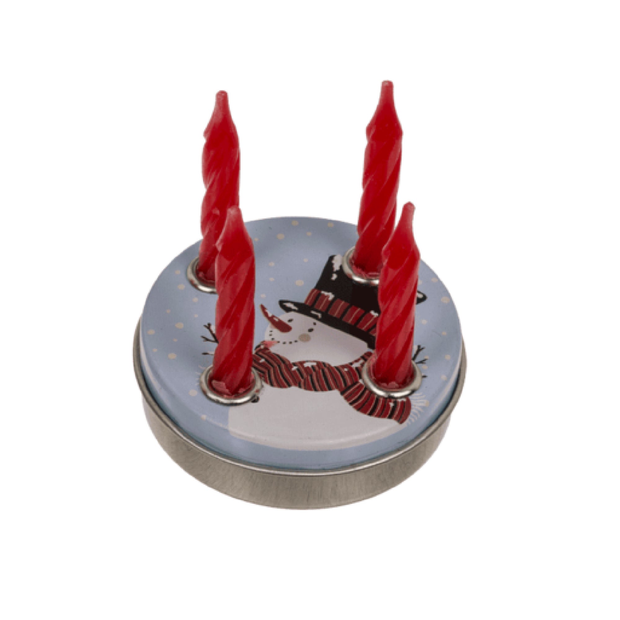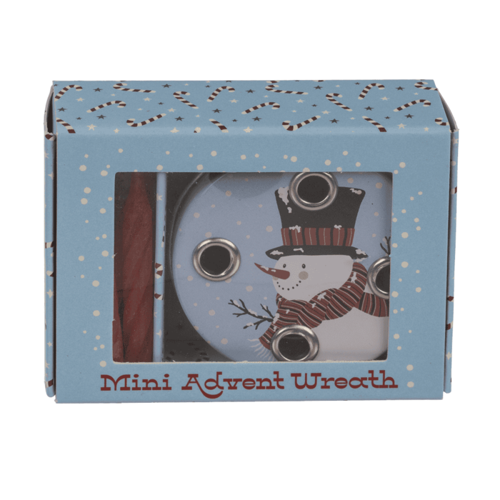 Der Mini-Adventskranz im Hosentaschenformat ist eine süße Aufmerksamkeit in der Weihnachtszeit, z.B. als Wichtelgeschenk oder Adventskalenderfüllung. Die kleine Blechdose mit Schneemann-Motiv und vier passende Kerzen sind in einem Geschenkkarton verpackt.