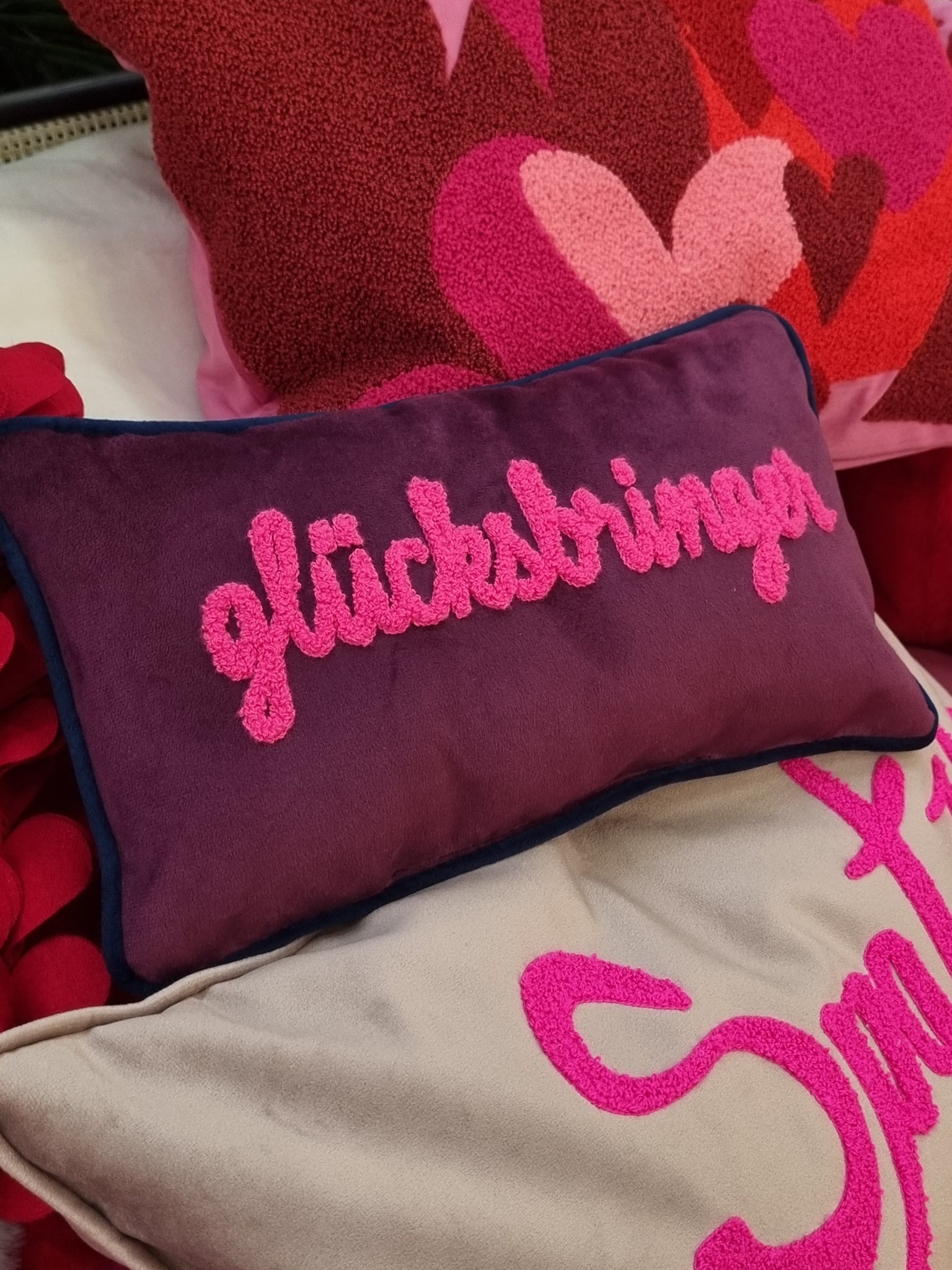 Das kleine Kissen mit "Glücksbringer"-Schriftzug ist Teil der limitierte "Petite"-Kollektion von pad. Es eignet sich hervorragend als kleine Aufmerksamkeit für große Aufgaben, Seelentröster und Wegbegleiter. Der pinke Schriftzug ist fluffig getuftet und hebt sich sowohl farblich als auch haptisch vom weichen Samtstoff in dunklem Violett ab. Das Kissen ist mit einer dunkelblauen Paspel umsäumt.