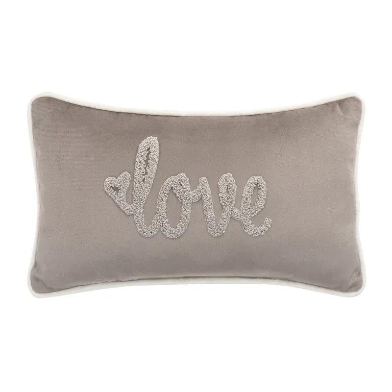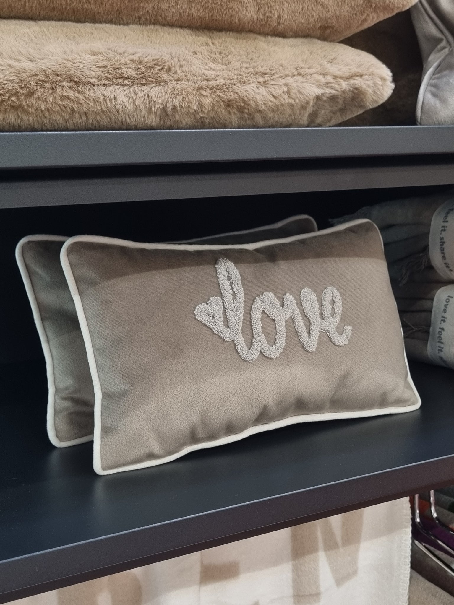 Das kleine Kissen mit "Love"-Schriftzug ist Teil der limitierte "Petite"-Kollektion von pad. Es eignet sich hervorragend, um eine gemütliche Kissenlandschaft auf dem Sofa oder Bett zu ergänzen. Der Schriftzug ist fluffig getuftet und hebt sich dadurch vom weichen Samtstoff in Taupe ab. Das Kissen ist mit einer farblich passenden Paspel umsäumt.
