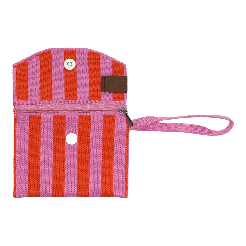 Das Portemonnaie ist aus einem strapazierfähigen Gewebe mit modernem Streifenmuster in Rosa und Orange. Es wird mit Reißverschluss und Magnetknopf geschlossen und hat einen praktischen Henkel, an dem es z.B. in der Handtasche oder am Schlüsselbund befestigt werden kann.