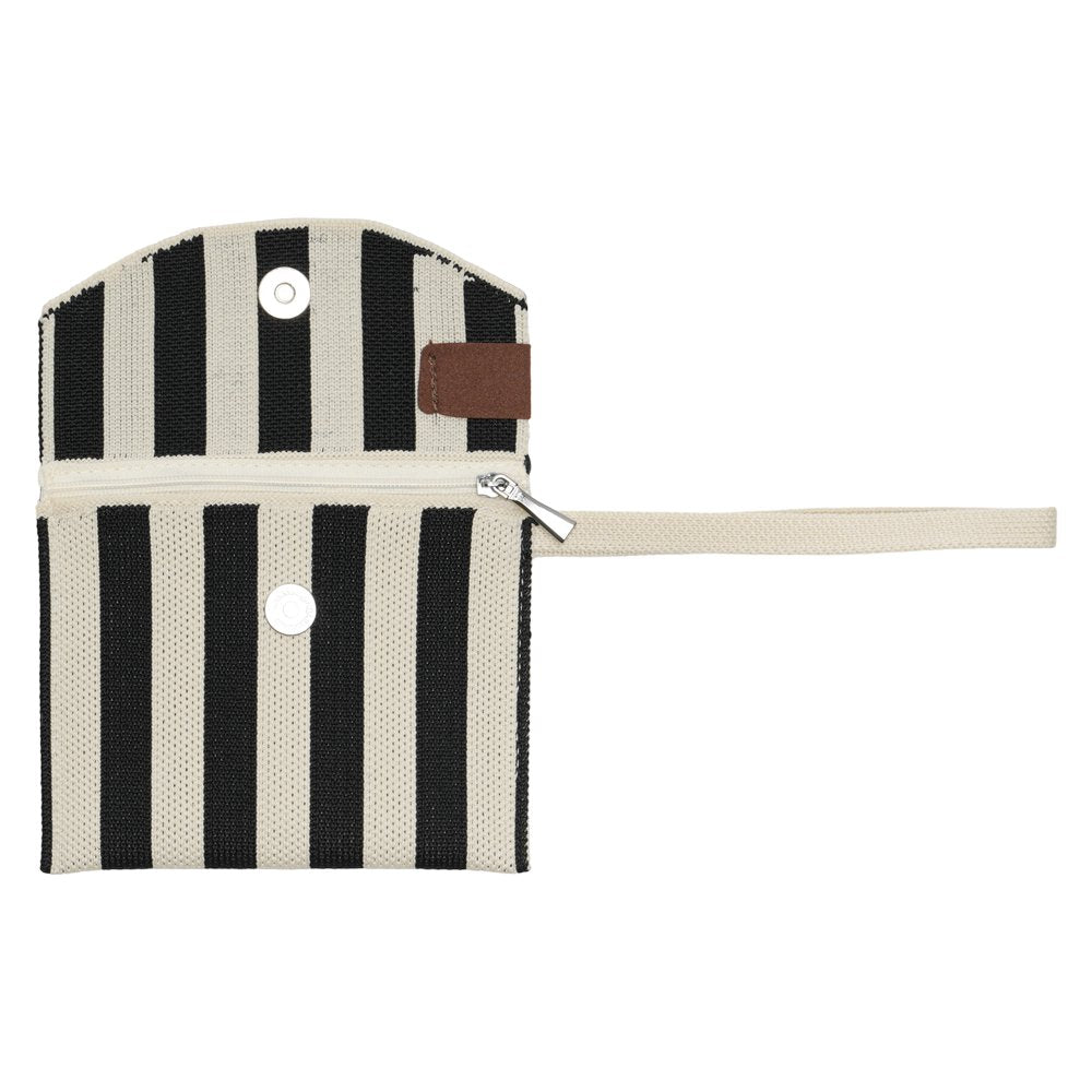Das Portemonnaie ist aus einem strapazierfähigen Gewebe mit modernem Streifenmuster in Schwarz und Cremeweiß. Es wird mit Reißverschluss und Magnetknopf geschlossen und hat einen praktischen Henkel, an dem es z.B. in der Handtasche oder am Schlüsselbund befestigt werden kann.