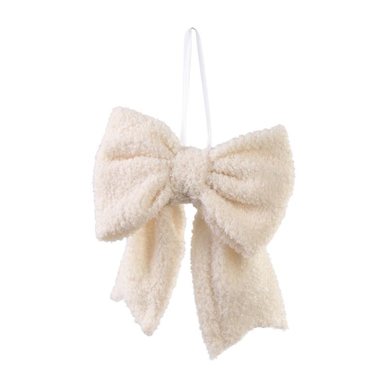 Der Schleifen-Trend in der Weihnachtsdeko hält auch in diesem Jahr an! Diese Schleife ist aus kuscheligem, cremeweißen Teddystoff gebunden und eignet sich mit ihrem Band zum Aufhängen perfekt als Schmuck für den Weihnachtsbaum.