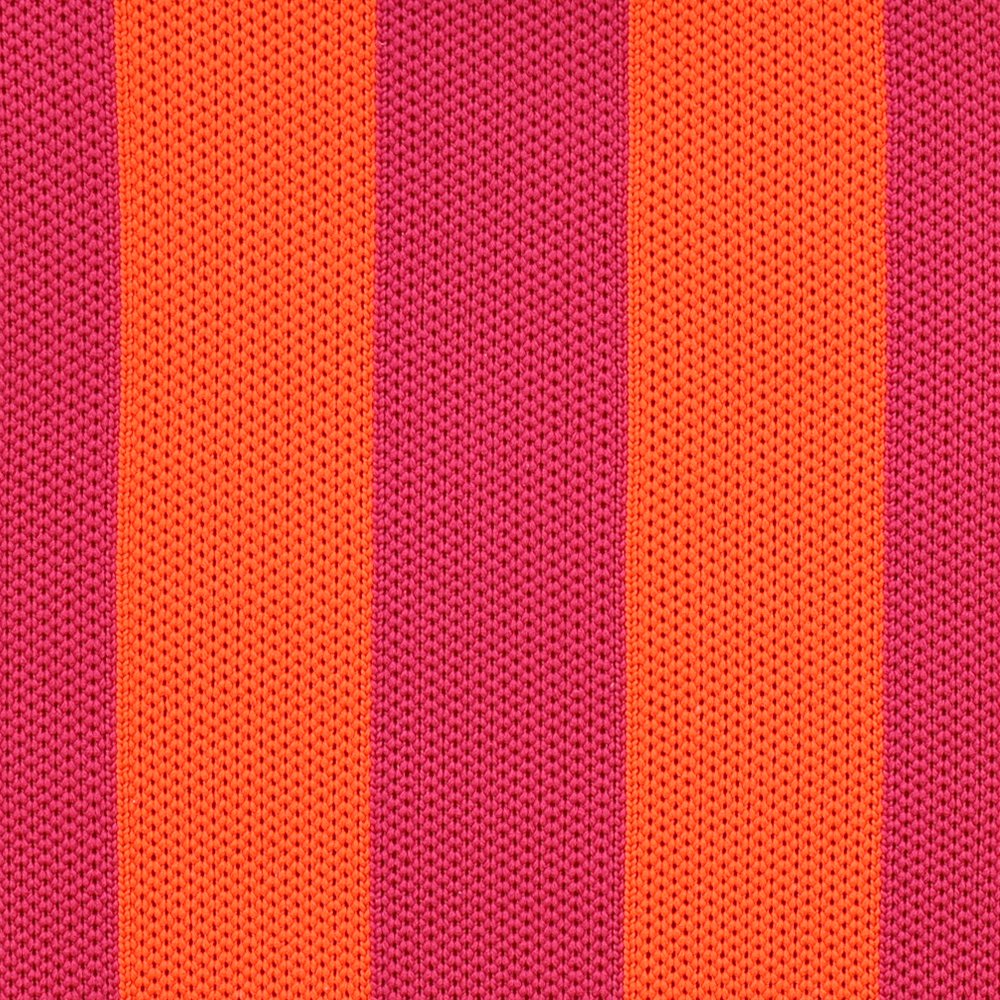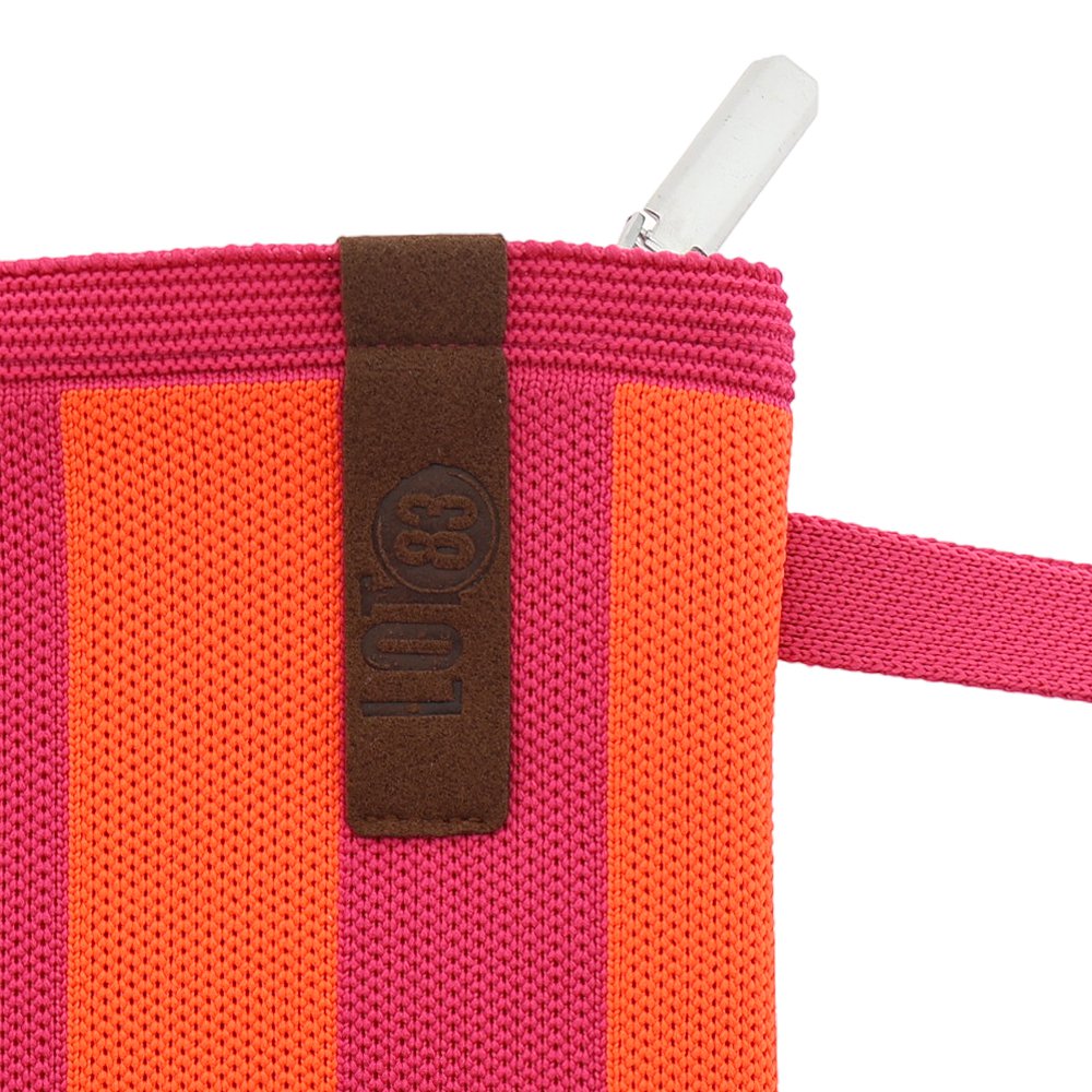 Die Tasche ist aus einem strapazierfähigen Gewebe mit modernem Streifenmuster in Pink und Orange. Sie wird mit einem Reißverschluss geschlossen und hat einen praktischen Henkel für das Handgelenk. Innen ist sie mit schwarzem Stoff gefüttert.