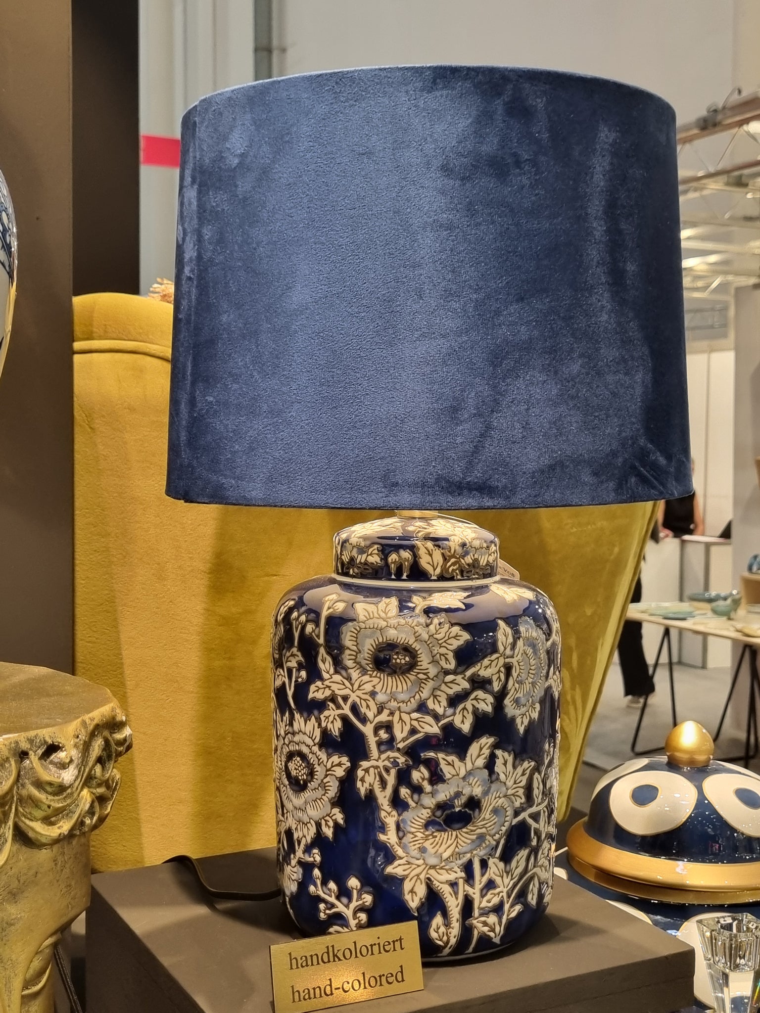 Die Tischleuchte "Blue Flower" ist ein eleganter Hingucker. Der Keramiksockel mit blau-weißem Blumenmuster ist handkoloriert. Der runde Lampenschirm ist mit blauem Samt bezogen und rundet das elegante Gesamtbild wunderbar ab.