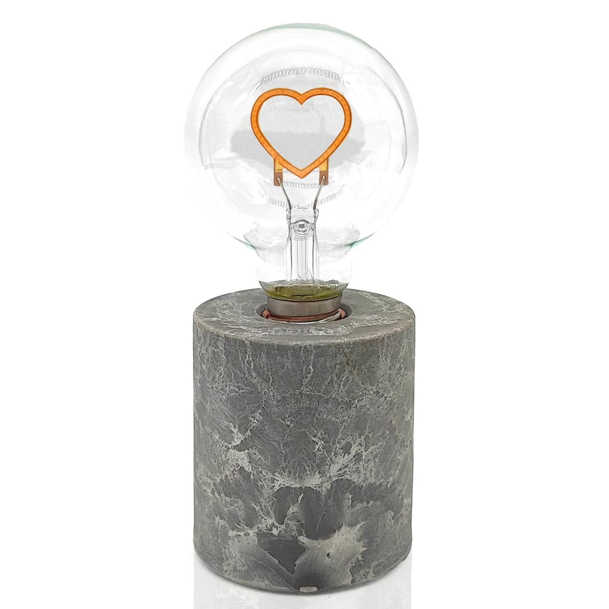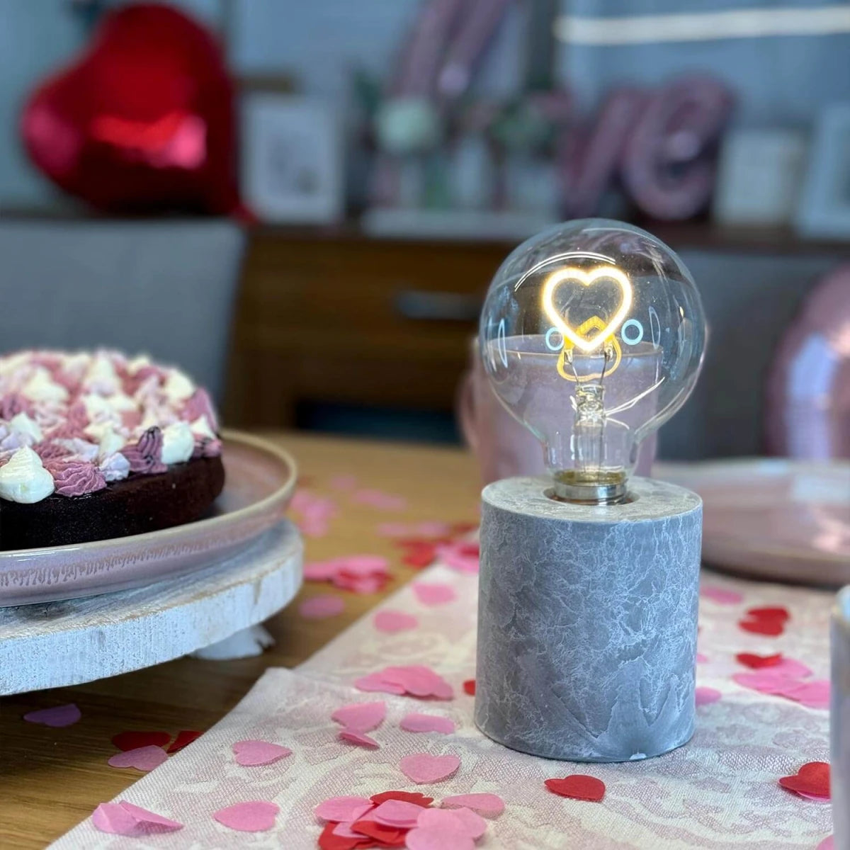Die Tischleuchte Lucia kommt mit einem Sockel in grauer Betonoptik einem Leuchtmittel in Form einer Glühbirne. Wird die Lampe eingeschaltet, strahlt ein kleines Herz im Inneren des Leuchtmittels mit warmweißem Licht.