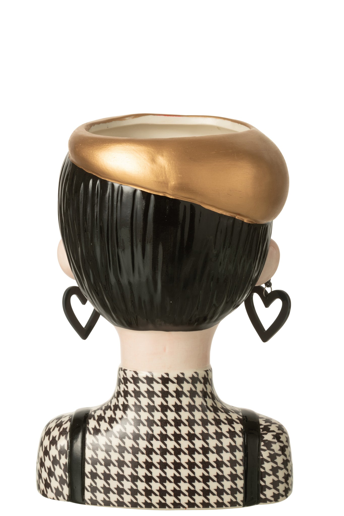 Die coole Vase in Form eines Frauenkopfs versprüht französisches Flair: die Dame trägt eine schwarze Pixie-Frisur, getoppt von einer goldenen Baskenmütze. Als Accessoires hat sie eine mondäne Sonnenbrille und herzförmige Ohrringe gewählt, die den schwarz-weißen French Chic wunderbar ergänzen. In diesem Look ist die Vase auch ohne Blumen stets ein echter Hingucker!