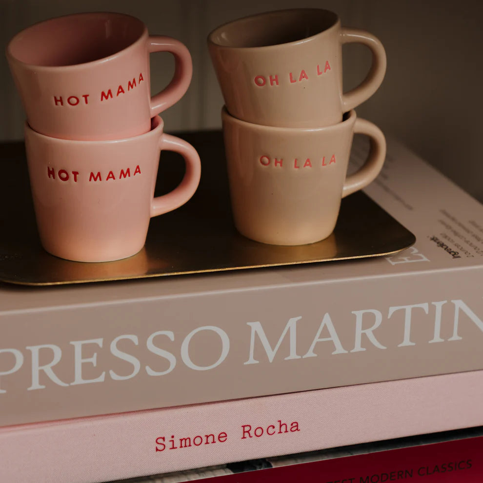 Die Espressotasse von Vondels kommt mit minimalistischem "Oh La La"-Schriftzug, der dezent die beige Keramiktasse schmückt.