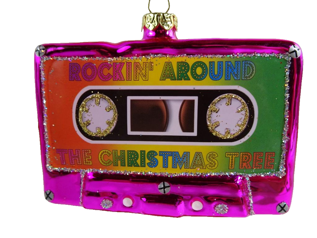Der ausgefallene Weihnachtsanhänger kommt in Form einer Musikkassette. Der Aufdruck verrät, dass es sich dabei wohl um ein nostalgisches Mixtape mit Weihnachtshits handelt. Der Anhänger ist aus Glas und teilweise mit Glitzer verziert.